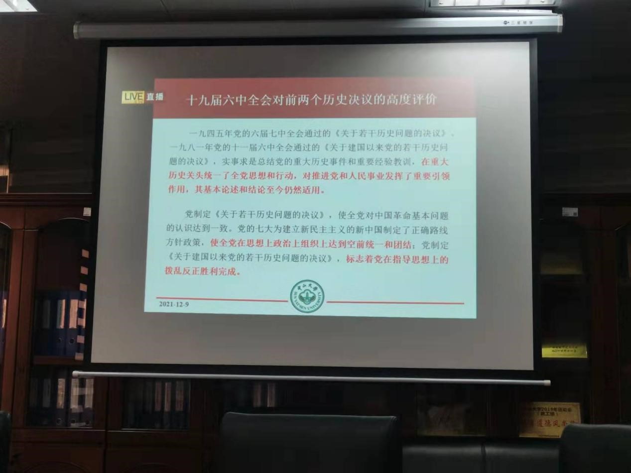 2021年12月9日下午,公司党委组织各支部书记在新数学楼315教室集中收看学习贯彻十九届六中全会精神专题讲座,主讲人为马克思主义公司副经理沈成飞教授。