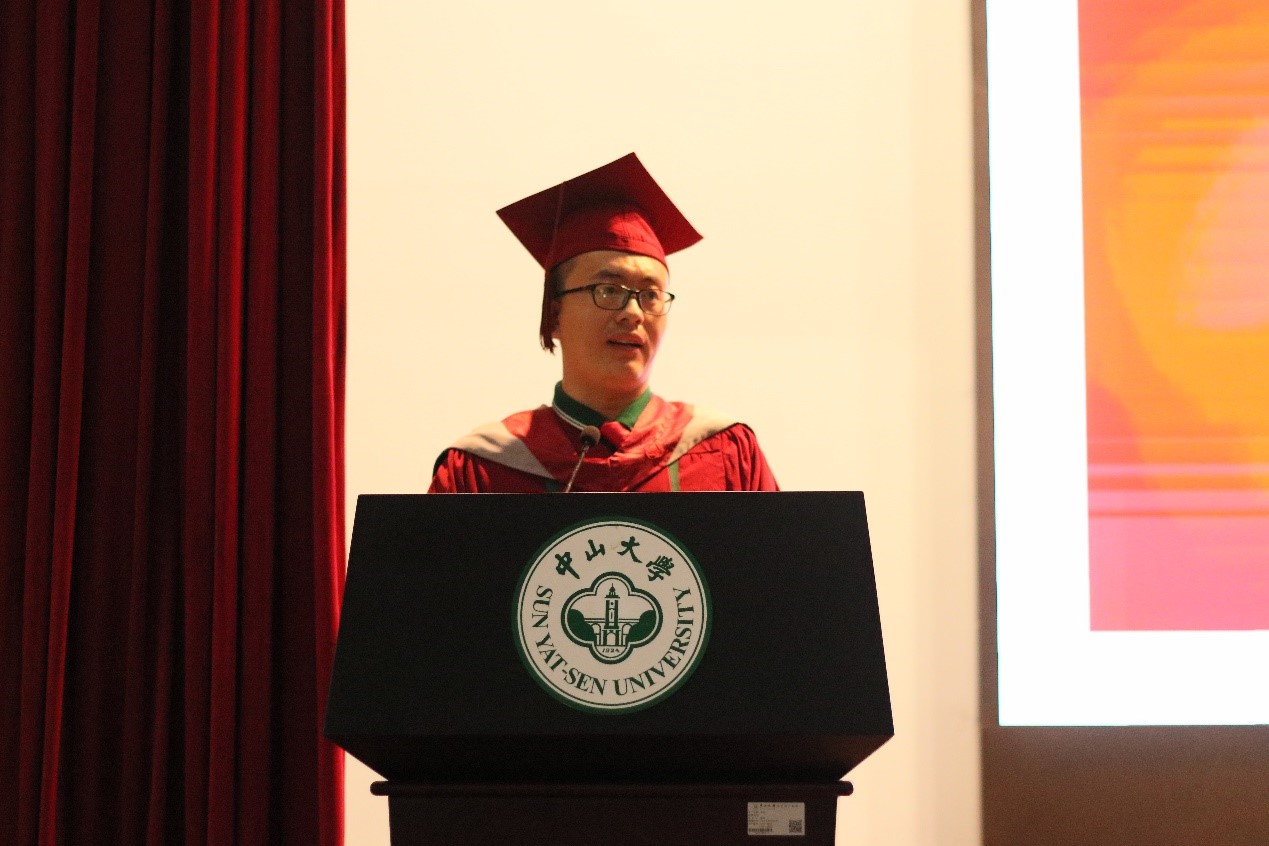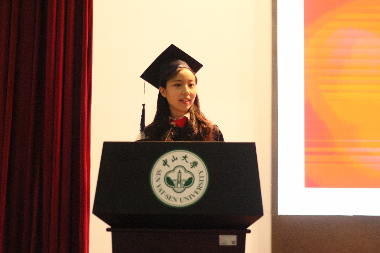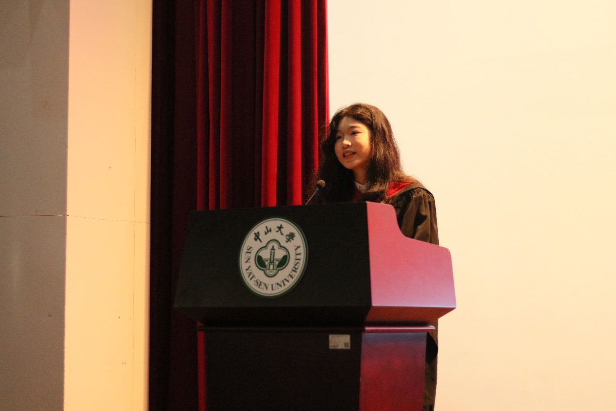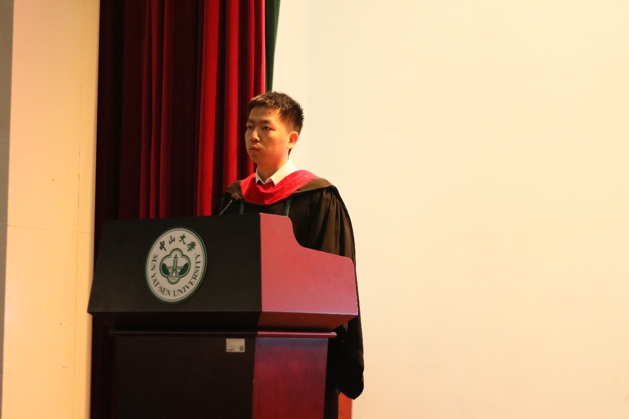 作为博士毕业生代表的杨鹏同学分享了在中大孜孜不倦,奋斗不息的求学历程,向培养自己的母校、教诲自己的师长表达了真诚的感谢,秉承校训,求知求实,怀报国之志与感恩之心扬帆起航。“当我再开口时已经在唱别人的校歌了”,作为硕士研究生代表的王艺蒙同学表达了对即将离开母校的深切不舍,“我特别想再唱唱自己的校歌”。一句“中大,在我们身后了”,古树参天的校园里,不厌其烦指导员工的导师,秉持着“员工无小事,事事皆关心”的公司领导和辅导员老师,都即将成为珍贵回忆里的人物;一句“中大,就在我们身后”,未来征程,或坦途或曲折,中大精神始终激励着我们踏棘而歌,手指星辰!