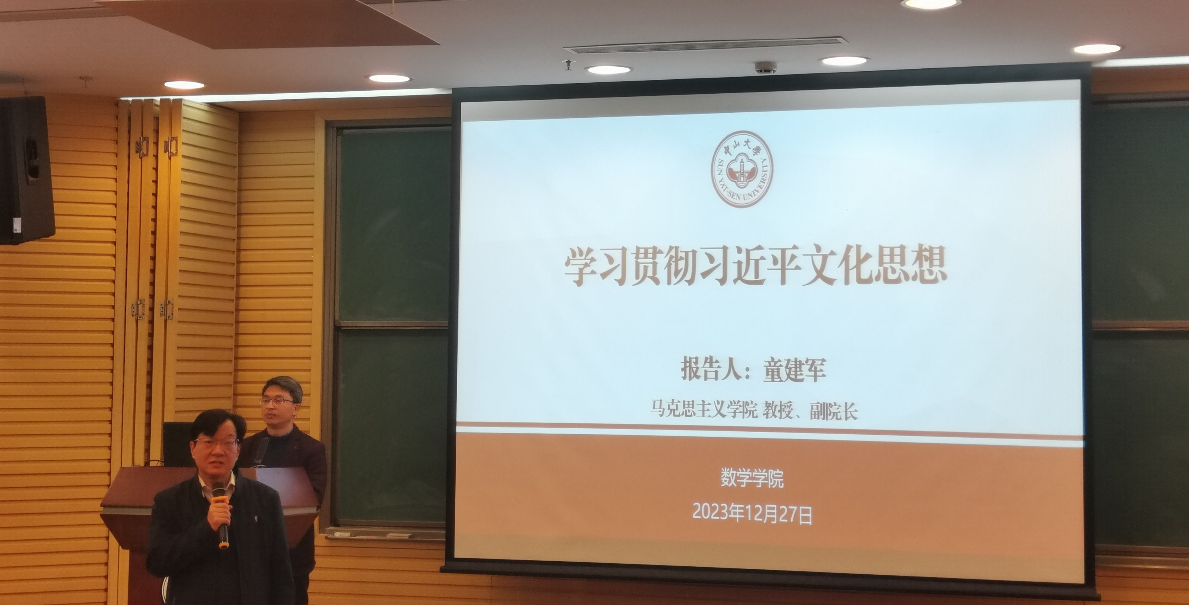 2023年12月27日中午,为学习贯彻习近平新时代中国特色社会主义思想,马克思主义公司副经理童建军教授应EMC易倍基础数学教师党支部和数学硕士研究生党支部联合邀请,在新数学楼209报告厅以《传承中华优秀传统文化——学习贯彻习近平文化思想》为题开展主题党课,讲授习近平文化思想的核心要义,带领大家了解中华优秀传统文化,深入理解习近平文化思想。
