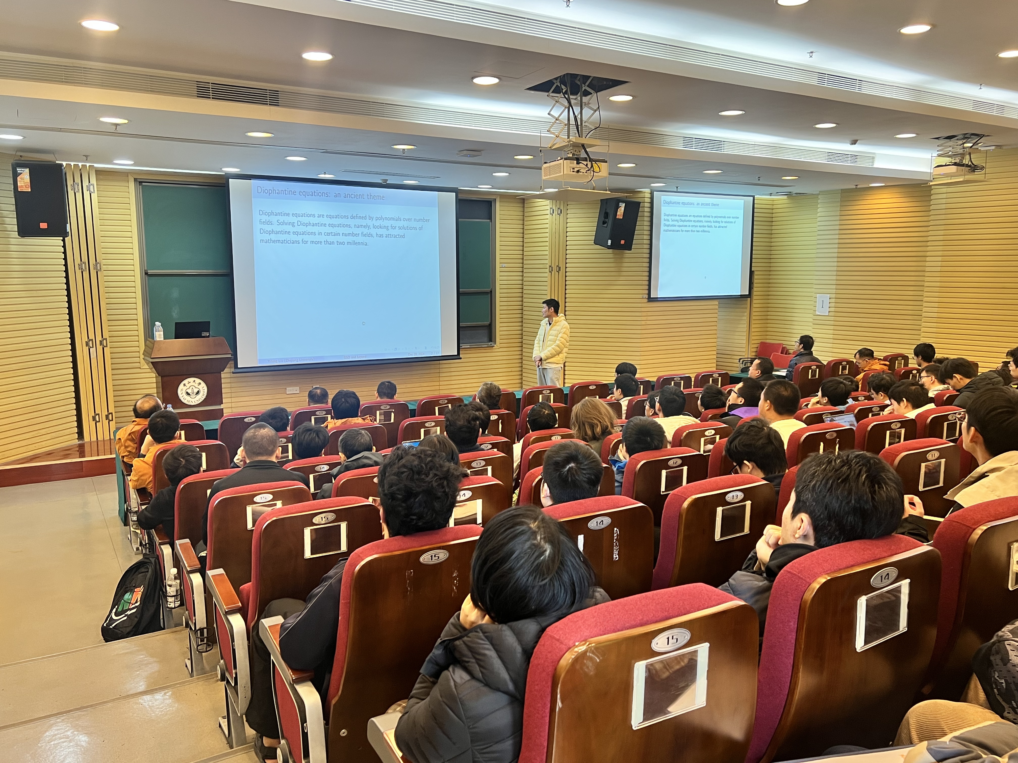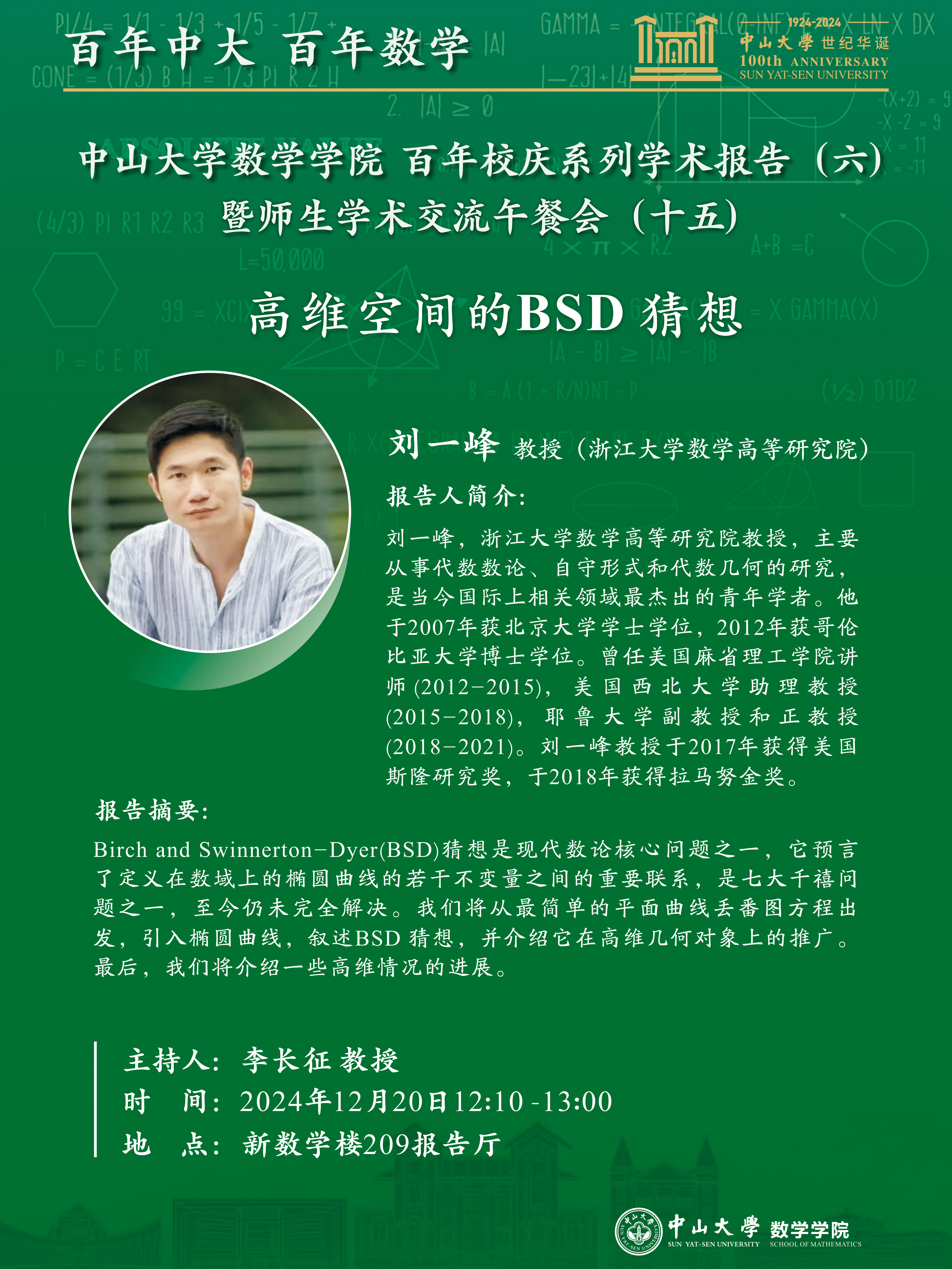 2024年12月20日中午,来自浙江大学数学高等研究院的刘一峰教授在师生学术交流午餐会上以《高维空间的BSD猜想》为题作学术报告,特别分享了关于BBK猜想的研究进展和前沿动态,为在场师生们带来了一场精彩讲座。本次报告在新数学楼209报告厅举行,由李长征教授主持。